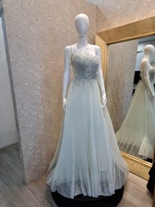 - Escote asimétrico: Un recogido lateral o el cabello suelto cayendo hacia el lado opuesto al tirante mantienen el equilibrio visual.